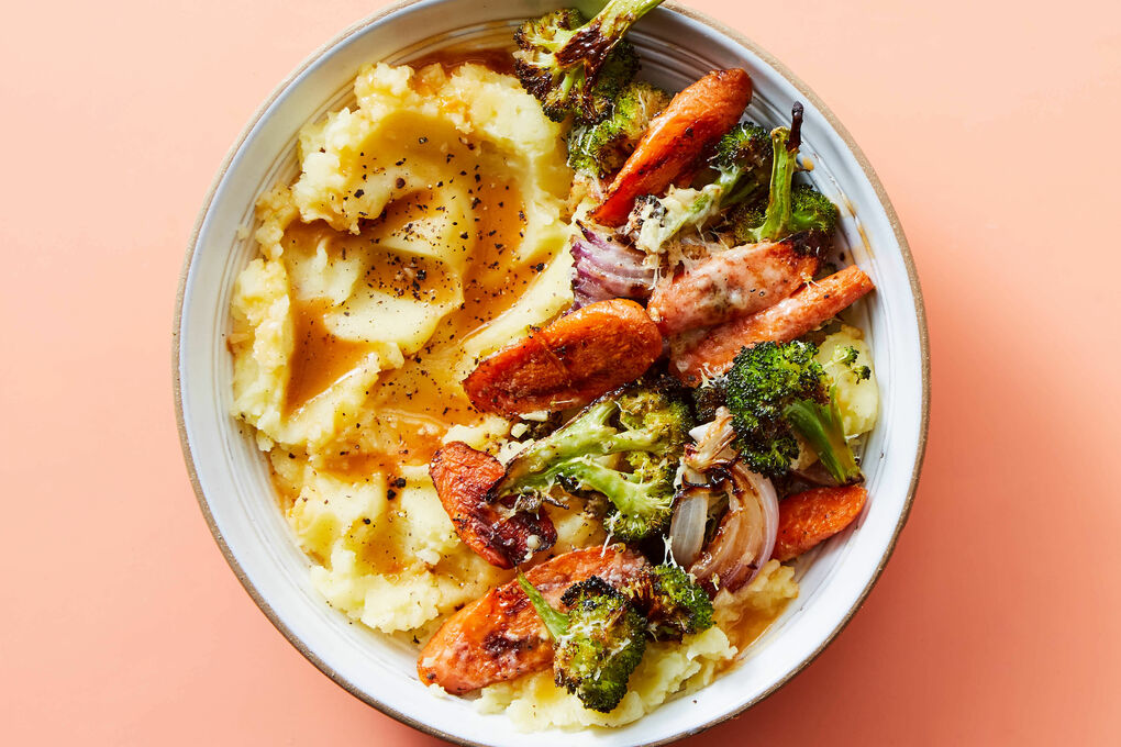Vegetarian Mashed Potato Gravy Bowl With Garlic Parmesan Broccoli Carrots Dinnerly